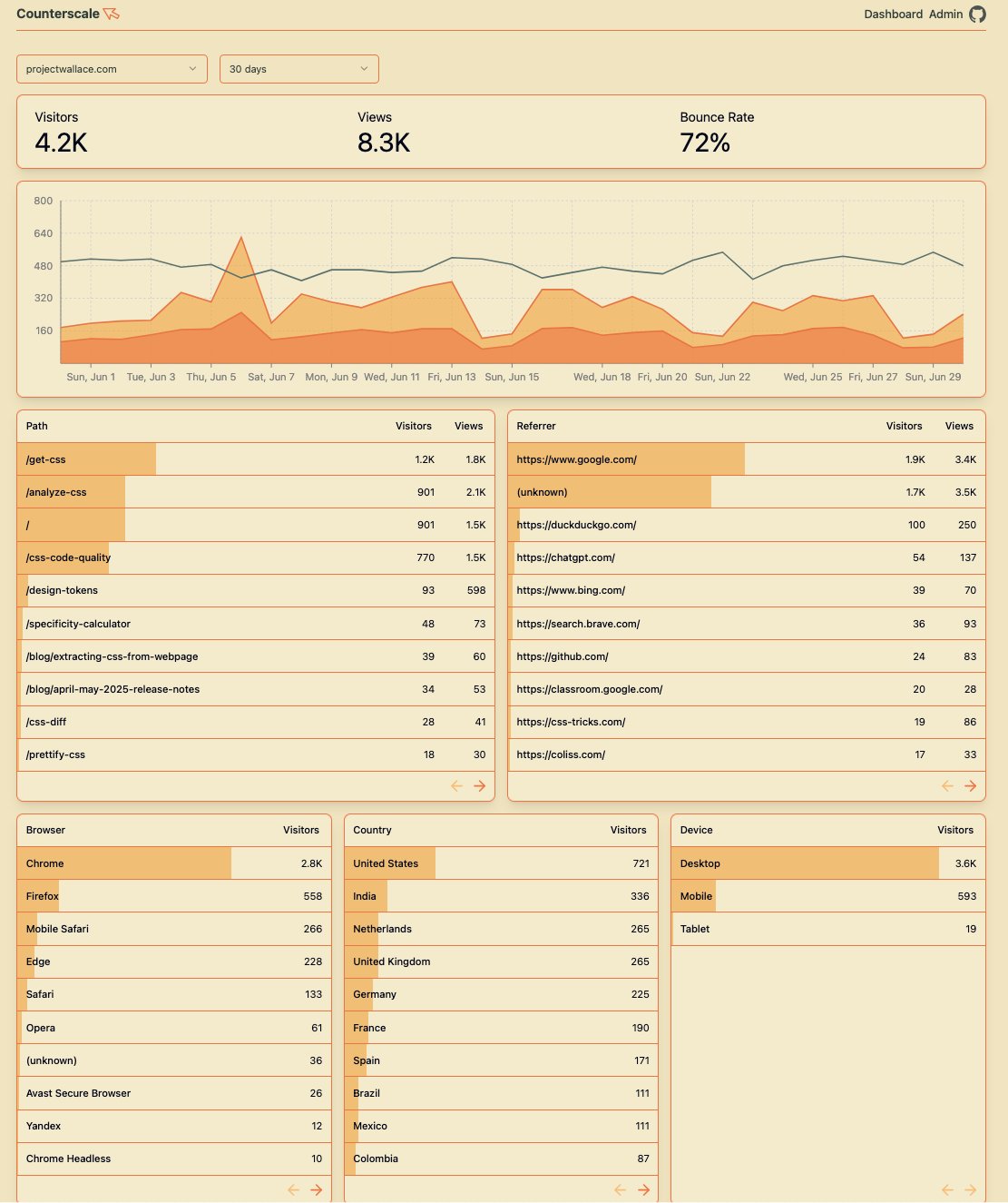 - Top pages: analyze-css (25%), get-css (21.7%), css-code-quality (18%), design-tokens (7%)